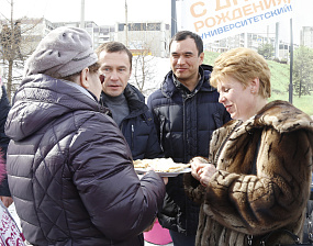 Жительница микрорайона Университетский Зоя Протасова каждый год посещает народные гулянья, по традиции она принесла всем гостям праздника собственноручно приготовленные блины.